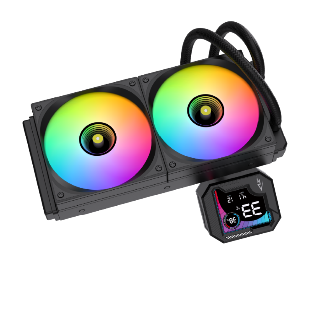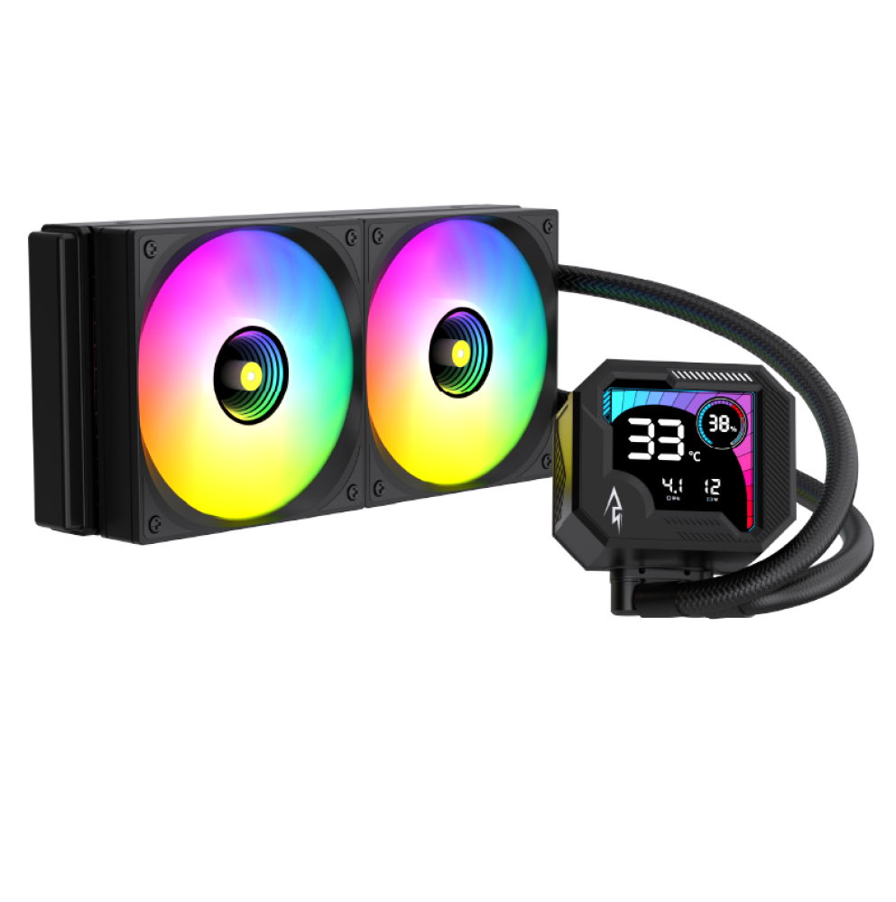 مبرد مائي متكامل (AIO) بمشتت 240 مم، يوفر تبريداً ممتازاً للمعالجات القوية. موثوق، سهل التركيب، ولون أسود قياسي مع أنابيب عادية، مما يجعله خيارًا فعالاً لتبريد مائي أساسي وعملي.